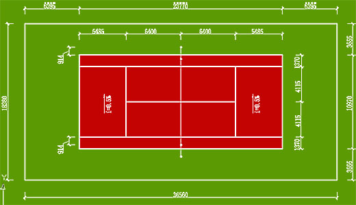 國際網聯和國家體委頒布的《網球競賽規則》中規定,一片標準網球場地的占地面積不小于36.6米(南北長)×18.3(東西寬)米,這一尺寸也是一片標準網球場地四周圍擋網或室內建筑內墻面的凈尺寸。在這個面積內,有效雙打場地的標準尺寸是:23.77米(長)×10.98米(寬),在每條端線后應留有余地不小于6.40米,在每條邊線外應流有余地不小于3.66米。在球場安裝網柱,兩柱中心測量,柱間距是12.80米,網柱頂端距地面是0.914米。